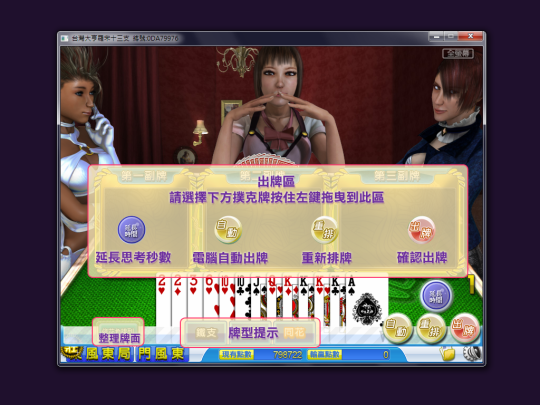 - 十三隻出牌方式是將手牌拖曳到上方三副牌的框中,等十三隻牌全部拖曳上去後按下確定就可以出牌了。( 也許你會覺得拖曳牌隻很麻煩,不過拖曳是可以提供更加真實的體驗,你可以將牌從第一副牌拖曳到第三副牌,或者將出的牌拖回手牌中。