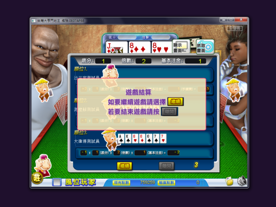 遊戲中繼續下一局須符合最低續局金額限制,玩家低於續局點數時要同局的所有玩家願意繼續,此時低於續局點數的玩家才能繼續,玩家如果在這裡選擇離開(不扣點)。