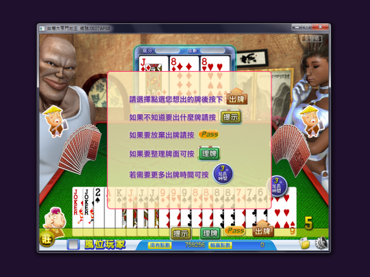 - 首先將三張底牌交給地主,這三張底牌所有人都能看到。由地主開始出牌,輪到玩家時可以選擇Pass不跟或 按『提示』找出可跟之牌形〈當玩家連續按時則依順序大小找出可跟之牌型〉。