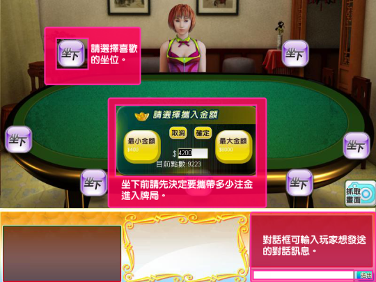 當玩玩家在進入牌桌觀局後,若有位置,選擇座位按鈕之後即可坐下加入牌局。在這之時系統會要求您選擇您欲攜入多少金額進入遊戲,請在最大及最小間擇一金額即可。